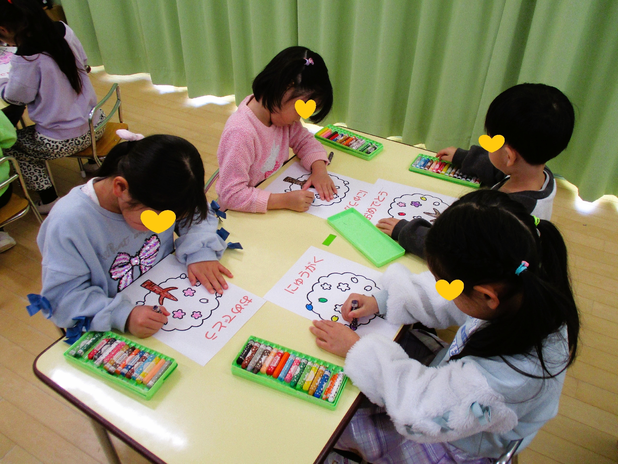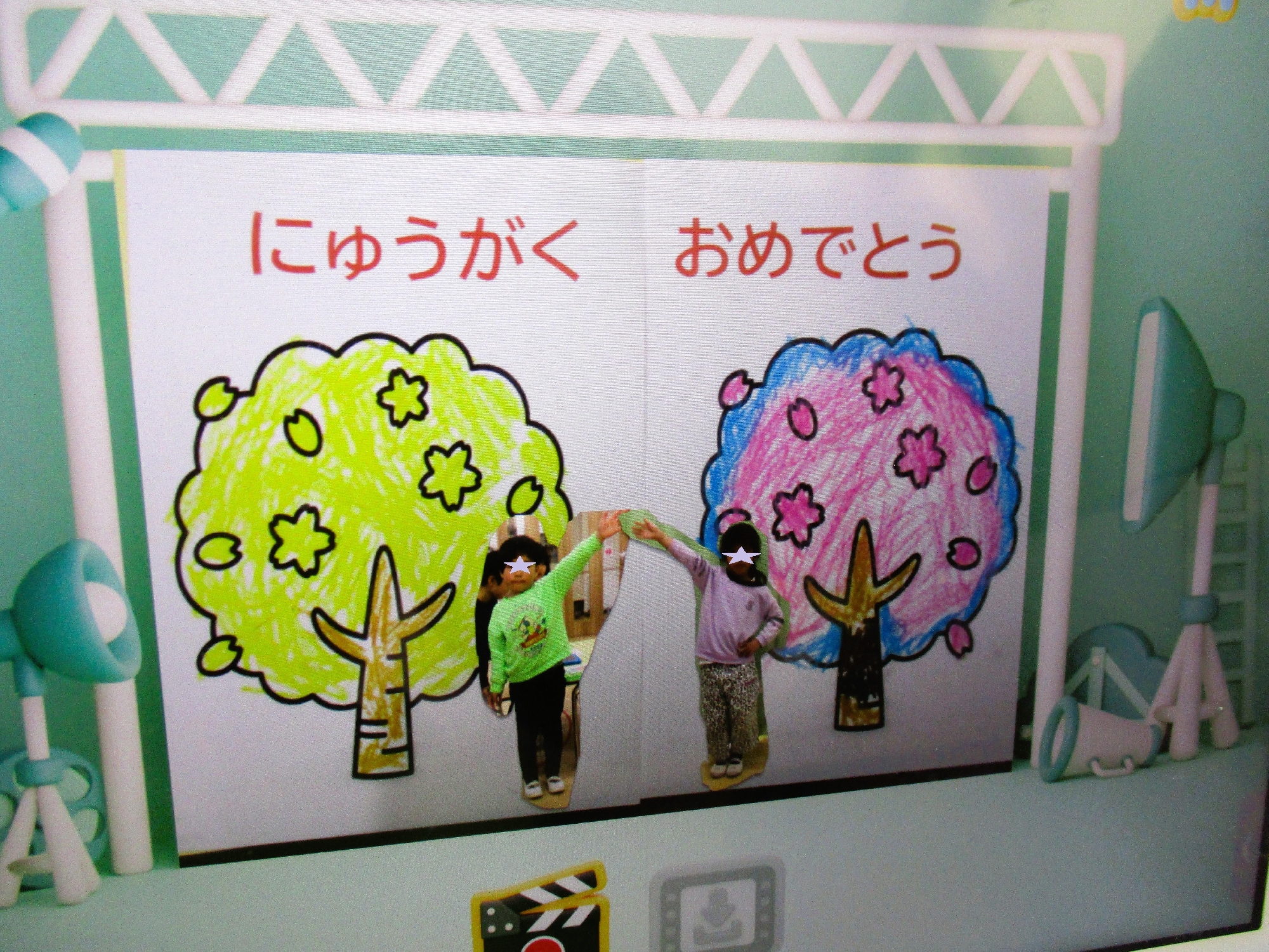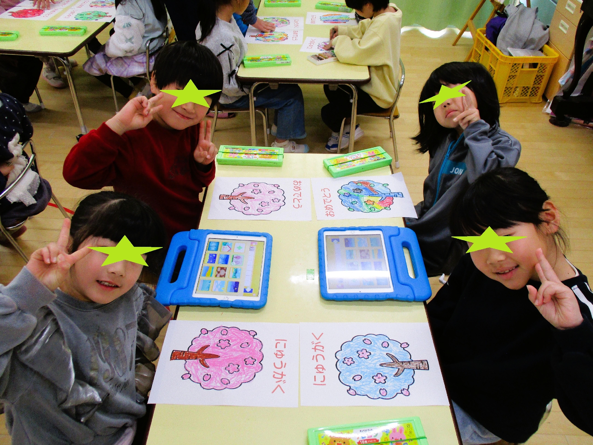 小学校の1日の生活の動画を見たり、桜のぬり絵をして、お友だち同士で写真を撮って
